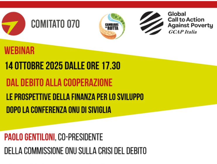 Il 14 ottobre 2025 si è svolto il webinar “Dal debito alla cooperazione. Le prospettive della finanza per lo sviluppo dopo la Conferenza ONU di Siviglia”,  promosso dal Comitato 070, da GCAP e dalla Campagna Cambiare la rotta, insieme alle reti delle ONG AOI, CINI e LINK 2007.